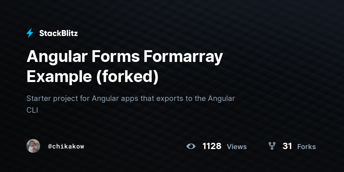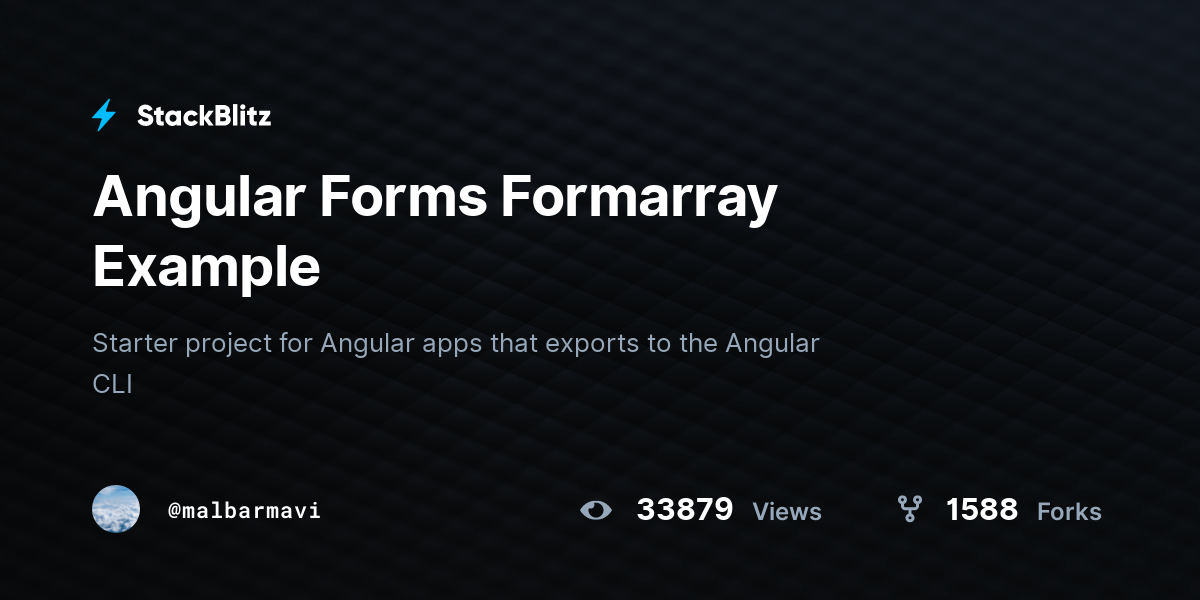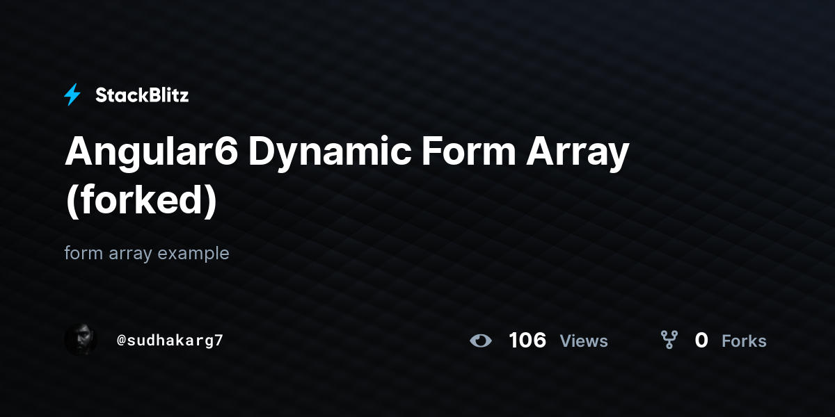 Form Array Angular Stackblitz - Starter project for angular apps that exports to the angular cli. Web i have implemented a stackblitz where you can create a dynamic form using some configuration. Web a quick example of how to build a dynamic form with validation in angular 14 using reactive forms. 38.0k view s 3.2k fork s. Starter project for angular apps that exports to the angular cli. Starter project for angular apps that exports to the angular cli. Import { component, oninit } from @angular/core; Web angular formarray tracks the value and validity state of an array of formcontrol, formgroup or formarray.