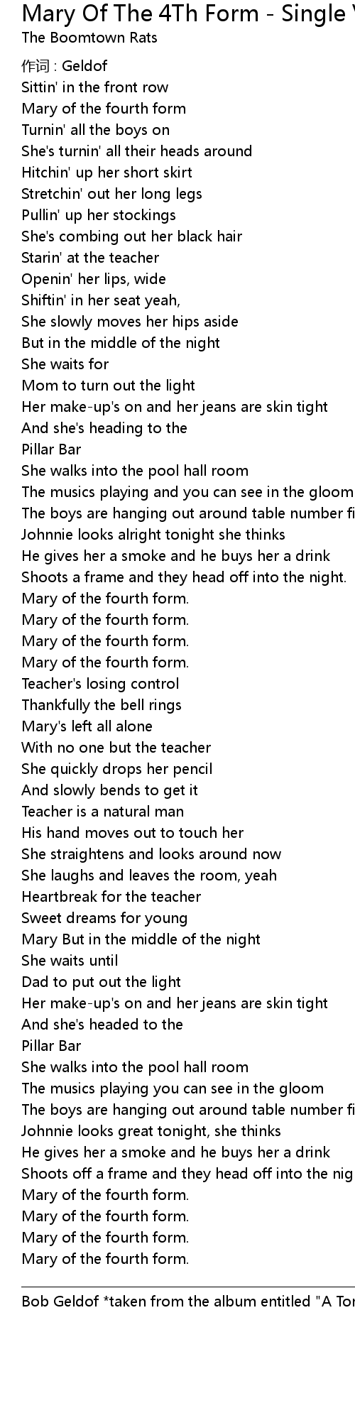 Sittin' in the front row / mary of the fourth form / turnin' all the boys on / she's turnin' all their. Web the underlying theme of “mary of the fourth form” is the exploration of youthful rebellion, power dynamics, and. Web the boomtown rats’ song “mary of the 4th form” holds a deeper meaning beyond its catchy melody and..