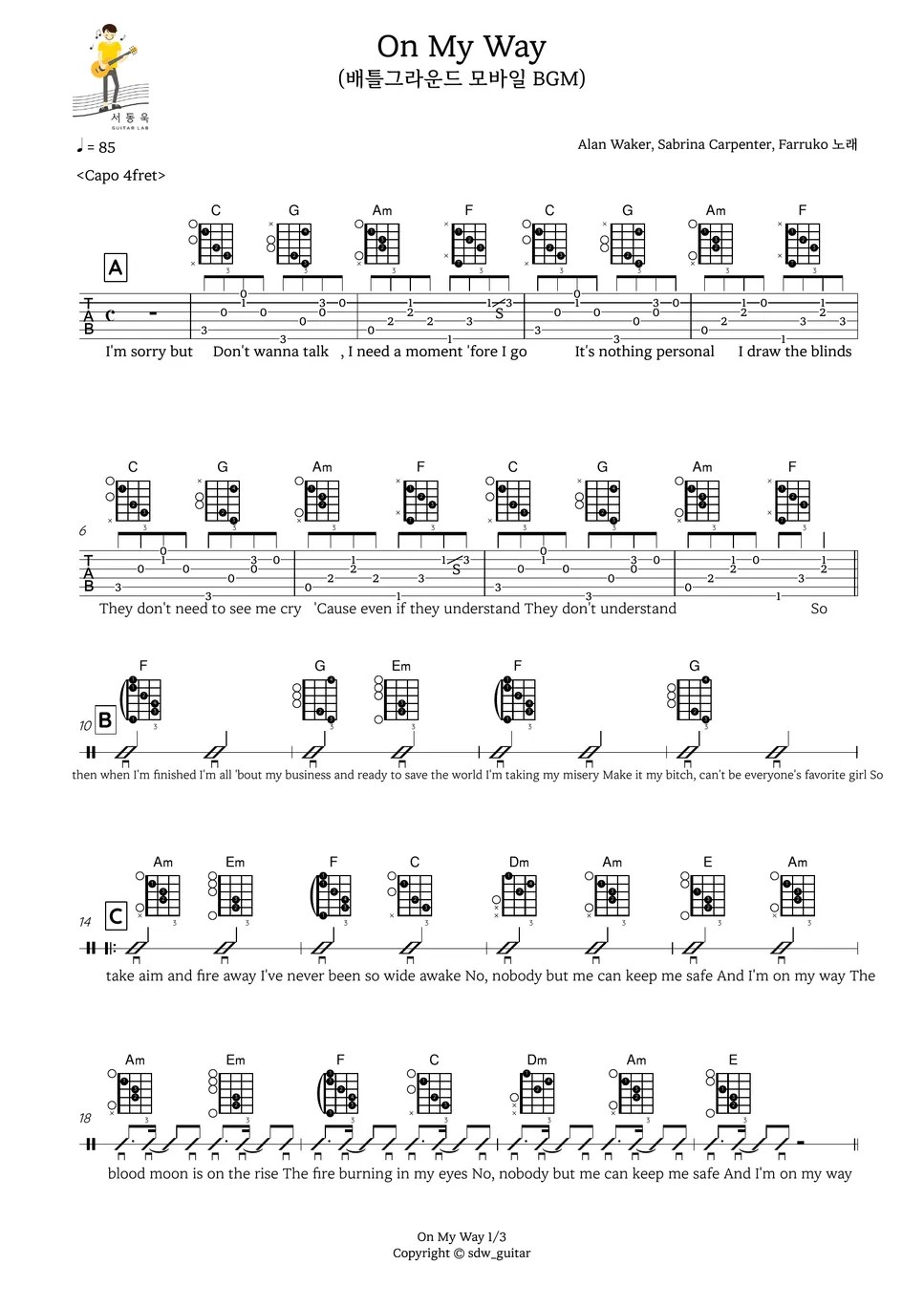 Alan Walker On My Way (Guitar TAB) Sheet by 서동욱