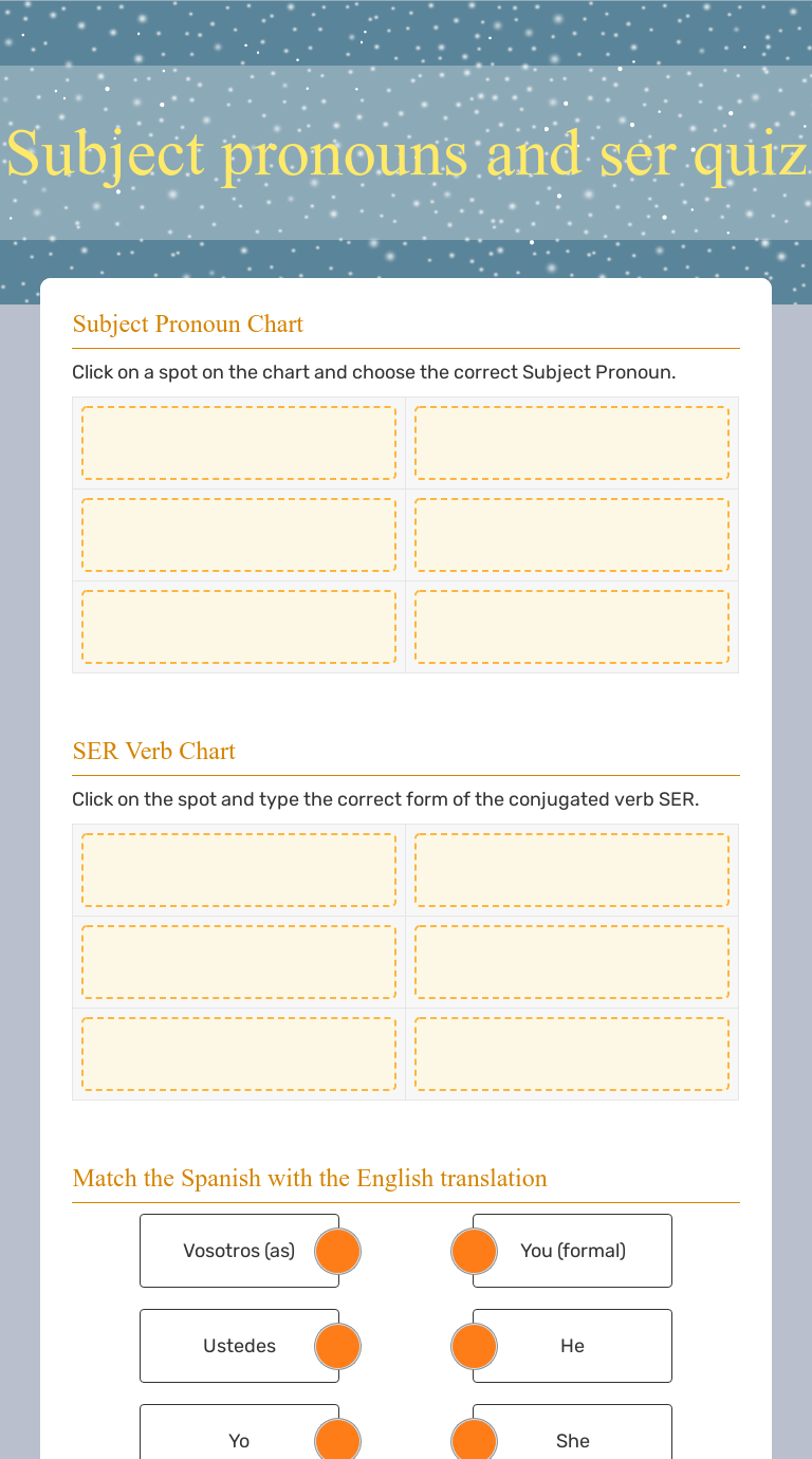 Subject pronouns and ser quiz Interactive Worksheet by Brooke Axsom Wizer.me